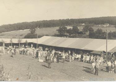 Nun stellte sich die Frage nach einem Schützenzelt. Als es gefunden und gemietet war, stellte Eberhard Fischer seine alte Zugmaschine zur Verfügung, und - obwohl die Auflaufbremse nicht mehr so recht funktionierte - fuhren er und unser 1. Brudermeister Heinrich Gross los, um das Zelt abzuholen. In den Kurven zwischen Schwitten und Brockhausen bekam Heinrich Gross es mit der Angst zu tun und sagte "Eberhard, du fährst zu schnell", worauf dieser verschmitzt lächelnd antwortete: "Ick hebb´nen Führerscheun!" Da tauchte ein junges Mädchen auf einem Fahrrad vor ihnen auf. Unser beherzter Fahrer rief. „Los die wollen wir mal abhängen“. Gab Gas und schon war es passiert. Die Anhänger kamen ins Schleudern und rumms ging es die Böschung hinunter. Das Gefährt landete im Runkelfeld, alle Räder zum Himmel. Was nun? Heinrich hatte zwar eine Beule am Kopf, aber das Zelt musste her. Er stellte sich an die Straße und spielte Anhalter. Ja, und Glück muss der Mensch haben. Obwohl 1948 nur wenige Autos fuhren, kam unser 1. Vorsitzender glücklich bis Menden und es gelang ihm, einen LKW von Herrn Schröder zu bekommen.