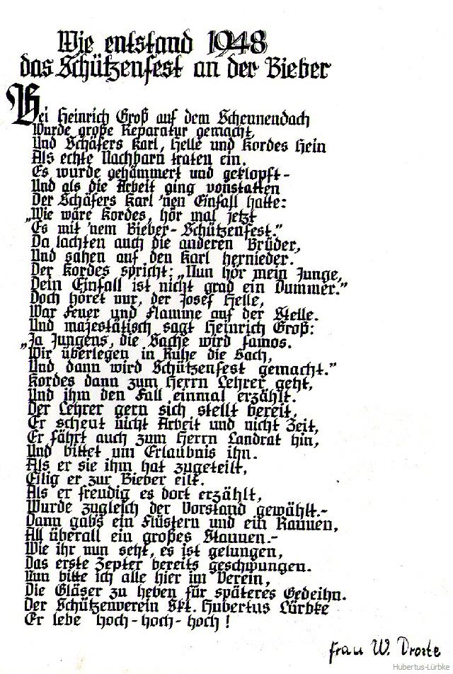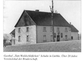 Am 8. August 1948 kamen dann 32 Lürbker Männer im Gasthof "Waldschlößchen" bei Schulte zusammen. Sie wählten einen Vorstand, gaben sich eine Satzung und beschlossen, am 13., 14. und 15. September 1948 das erste Schützenfest auf der Wiese bei Gross zu feiern.