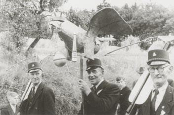 Probleme bereitete uns in den ersten Jahren das Schießen an der Vogelstange. Der erste Schützenvogel wurde mit Steinen herunter geholt. Das gefiel unserem Dechanten Meierfrankenfeld gar nicht. Er sagte nur: „Einen Vogel steinigt man nicht!“ Er blieb bei den Musikanten sitzen und blies lieber meisterlich das Waldhorn. Im 2. und 3. Schützenjahr wurde der Vogel mit der Armbrust von der Stange geholt. Hier war unser Dechant schon mit von der Partie. Heute wird nur noch wenigen Menschen bekannt sein, dass sich Teile der deutschen Division „Windhuk“ in den Wäldern rings um die Lürbke auflösten und viel Kriegsmaterial zurückließen, auch Karabiner und Munition. Und so schossen die Lürbker Schützen im 4. Jahr mit Waffen der Division Windhund ihren Vogel herunter. Natürlich gabe es dabei auch viele Blindgänger. Da haben es unsere Schießmeister heute leichter. Ein weiteres Jahr später hatte die Bruderschaft Beziehungen zur britischen Besatzungsmacht in Menden angeknüpft. Wir erhielten zwei Gewehre und Schuss Munition, die uns ein englischer Major persönlich in die Lürbker Schule brachte. Ja, unsere Schützenvögel aus knorrigen Wurzeln hatten Jahr für Jahr ein zähes Leben, und oft fiel es dem Schützen schwer, sie von der Stange zu holen. Einmal gab es sogar einen Stangenkönig und im Jahr 1986 musste der Vogel mit der Axt bearbeitet werden, weil sich die Munition dem Ende neigte.